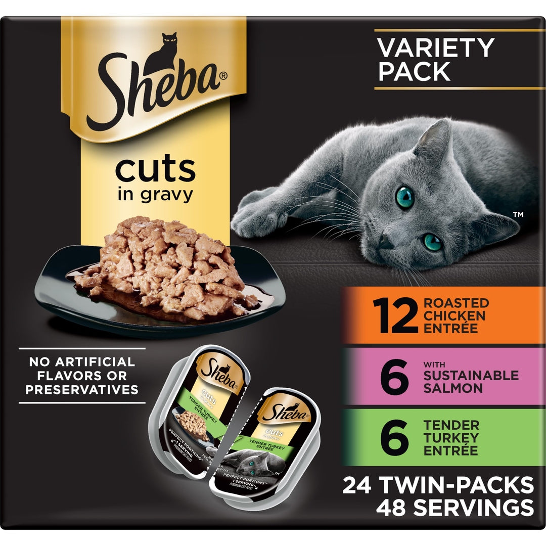 Sheba Perfect Portions Wet Cat Food Cuts in Gravy, Roasted Chicken Entree, with Sustainable Salmon, Tender Turkey Entree, 2.6 oz. Twin-Pack Trays (24 Count, 48 Servings)