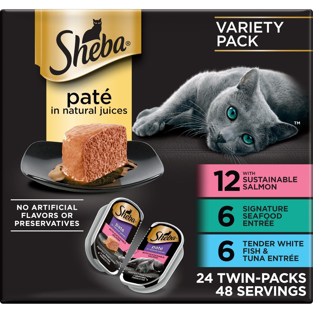 Sheba Perfect Portions Wet Cat Food Pate with Sustainable Salmon, Signature Seafood Entree, and Tender White Fish and Tuna Entree Variety Pack, 2.6 oz. Twin Pack Trays (24 Count, 48 Servings)