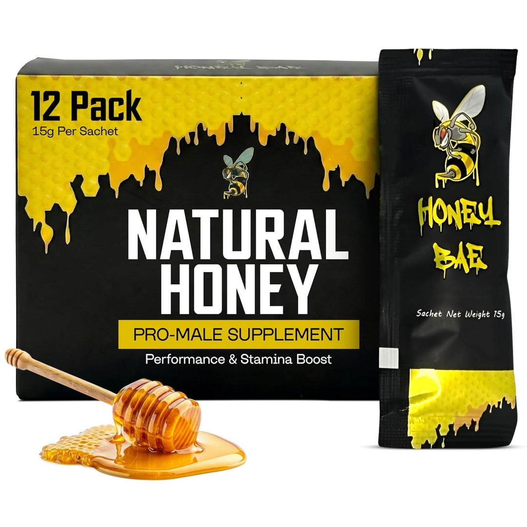 Honey Bae Natural Honey Satchets 12 Pack - Supplement for Vitality, Performance & Stamina - 15 Gram Satchet - Herbal Energy Boost for Men