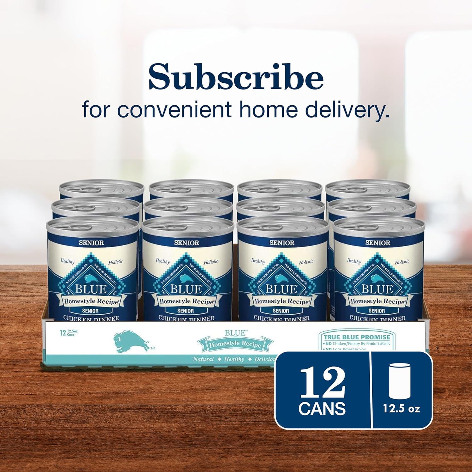 - Contains: Twelve (12) 12.5-oz cans of BLUE Homestyle Recipe Natural Senior Wet Dog Food, Chicken Dinner with Garden Vegetables