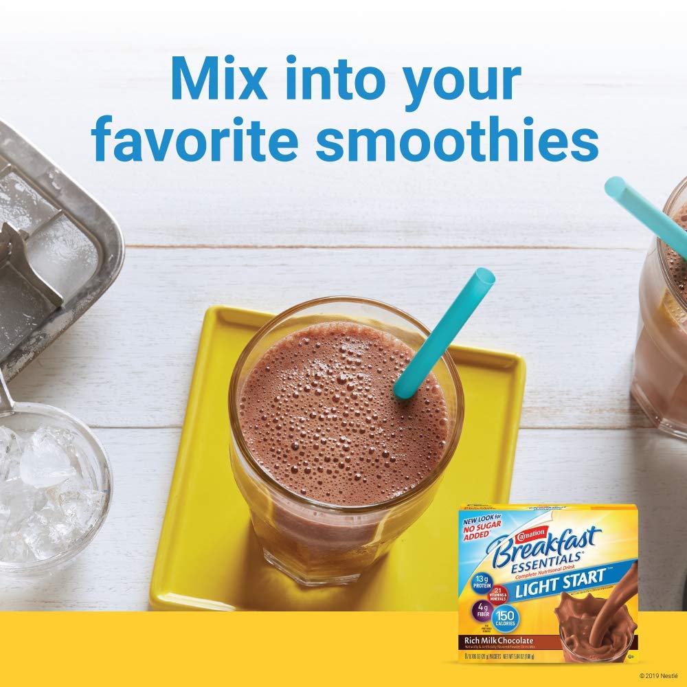 - Powder Drink Mix: Mix Carnation Breakfast Essentials Powder Drink Mix with skim milk or mix in a smoothie for a tasty, easy snack or breakfast drink and start the day right, with protein and other nutrients