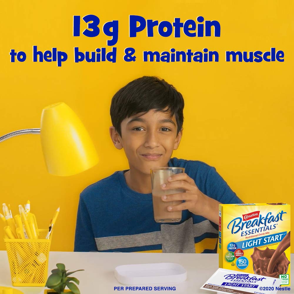 - Powdered Nutritional Drink: Snack or breakfast, drink with skim milk or add to smoothies, Carnation Breakfast Essentials Powdered Drink Mix provides 13g of protein when mixed with 1 cup of fat free milk