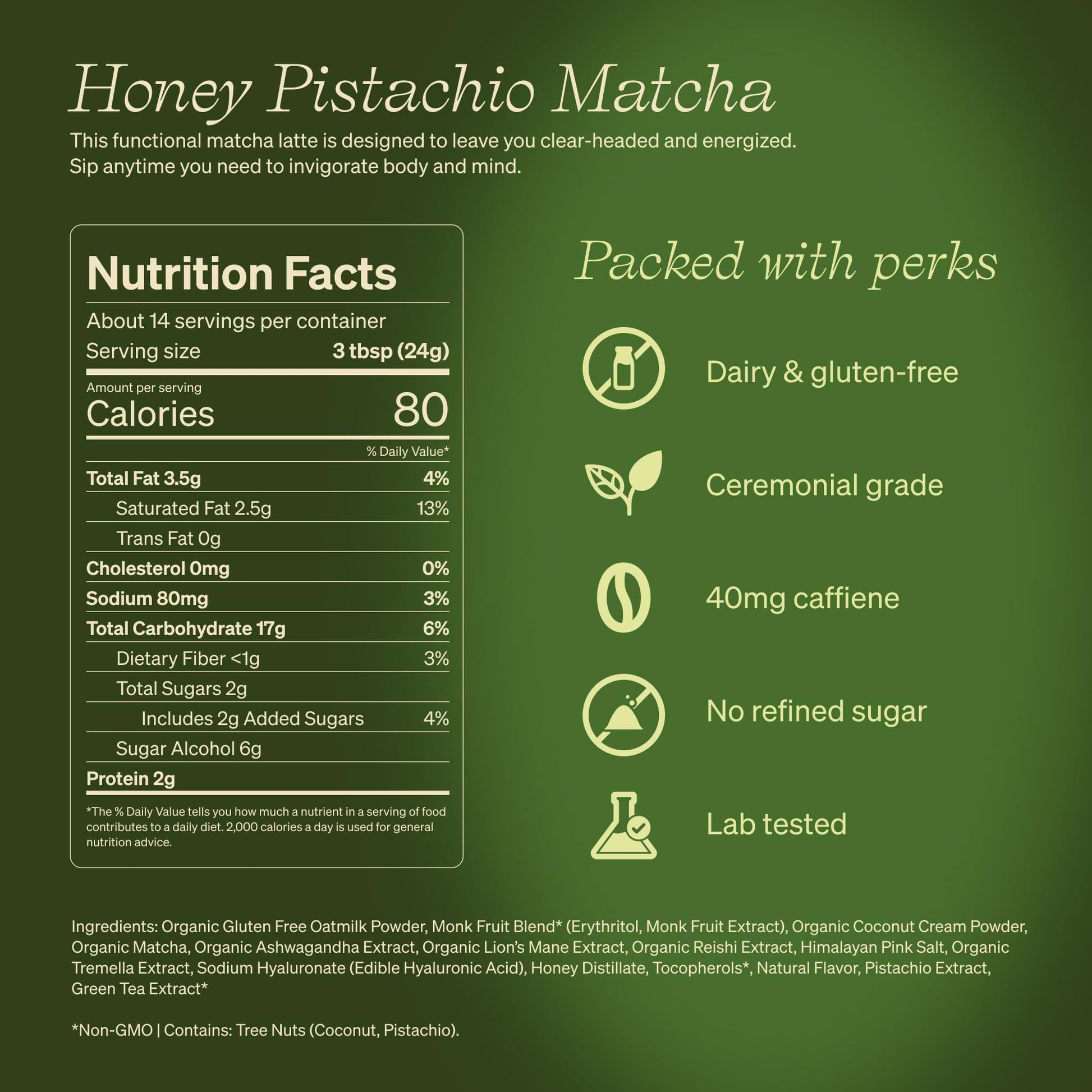 - FUNCTIONAL INGREDIENTS: Our organic matcha powder blends adaptogens, mushrooms, probiotics, and antioxidants. Probiotics support gut health, while adaptogens and mushrooms (Organic Lion’s Mane, Reishi & Ashwagandha) promote energy, positivity, and overall health. Matcha's EGCG firms and protects skin, chlorophyll supports clarity, and polyphenols help with tension.