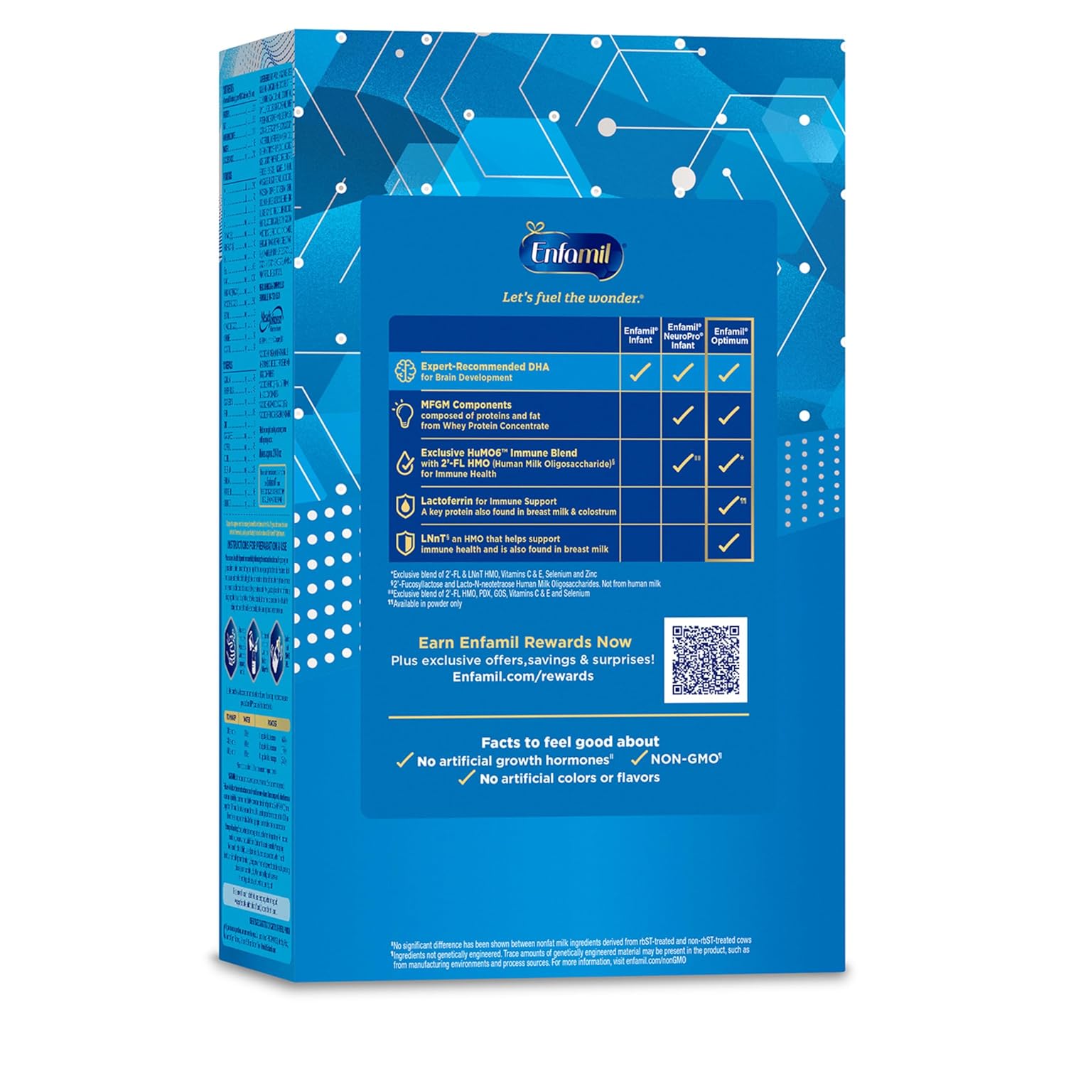 Give your baby a great start with Enfamil Optimum—our most advanced formula designed to support immune health and brain development, inspired by the composition of breast milk. Enfamil Optimum, formerly known as Enfamil Enspire Optimum, is our closest baby formula to breast milk. It has lactoferrin, a key immune-supporting protein also found in colostrum and breast milk. It also has a dual HMO blend—2'-FL and LnNT—two of the most abundant human milk oligosaccharides (HMOs) naturally found in breast milk, to help nourish your baby’s immune system. It has brain-building DHA and is made without artificial growth hormones*, artificial colors, or flavors, Enfamil Optimum is a non-GMO† option for parents seeking premium infant nutrition through 12 months of age. Whether you're combo feeding or transitioning from breastfeeding, this formula offers both peace of mind and convenience for growing families. Join Enfamil Family Beginnings to earn rewards with every purchase and access exclusive benefits and support. SNAP eligible.