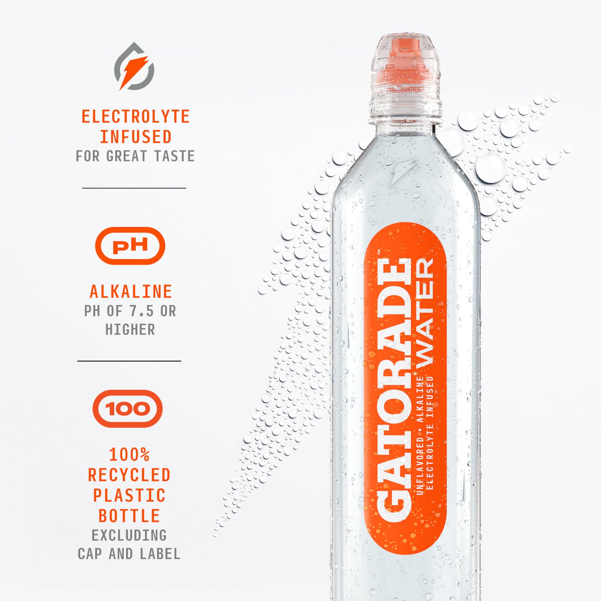 Details: *Gatorade Water has 250 mg/L of electrolytes while the leading unflavored enhanced water has 50 mg/L With a legacy over 40 years in the making, Gatorade brings the most scientifically researched and game-tested ways to hydrate, recover, and fuel up, which is why our products are trusted by some of the world's best athletes. Gatorade's first ever unflavored water is your new go-to for all day hydration, infused with electrolytes for great taste. Gatorade water brings the credibility of the bolt to unflavored enhanced water. Gatorade Water is the latest addition to the Gatorade hydration portfolio – formulated for all active people to hydrate throughout their entire day.