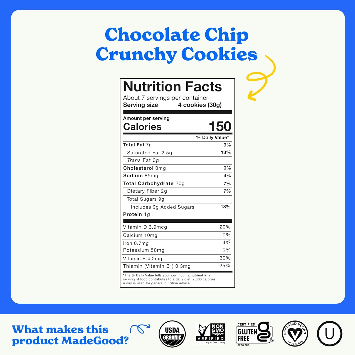 - CHOCOLATE CHIP: MadeGood Cookies are organic, gluten-free, vegan, and non-GMO. Indulge in a snack that both tastes good and is made good.