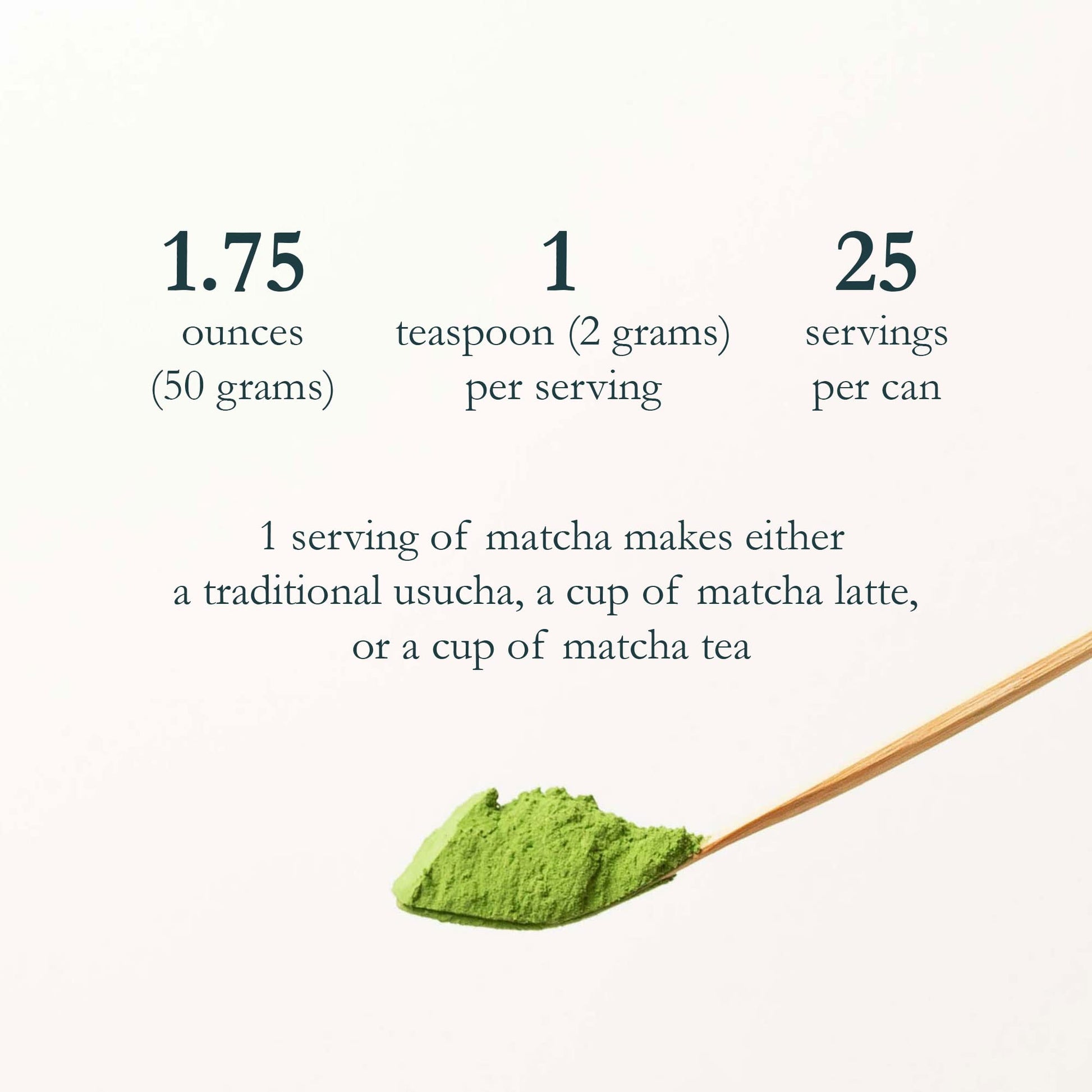 - ✓ We Want To Help You Enjoy Matcha – To ensure you have the best matcha experience, we provide our full guidance through directions for use, recipes and tips for enjoying it. Whether you like to drink matcha as a tea, or to mix it up as a latte or smoothie, we do not think there’s a right or wrong way to enjoy matcha. Our 1.4 oz / 40g tin serves a total of 20 servings. 1 tsp (2 grams) of matcha powder makes either a cup of matcha tea (usucha) or a small matcha latte.