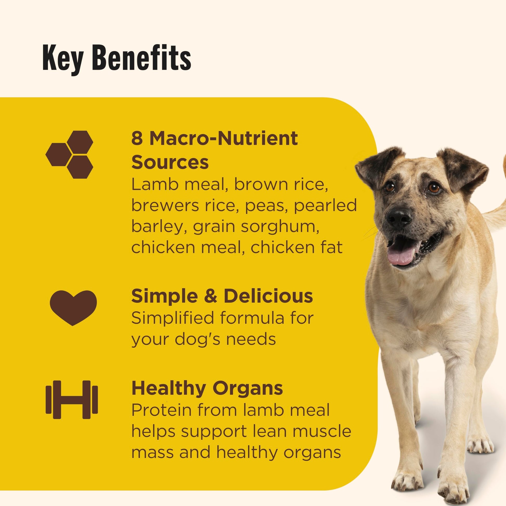 - Lamb dog food made with 8 macro sources to provide balanced nutrition for the pickiest of eaters