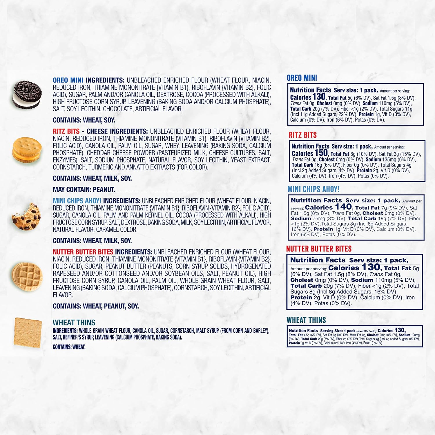 - 10 each of mini OREO Sandwich Cookies, mini CHIPS AHOY! Cookies, RITZ Bits Cheese Crackers, Nutter Butter Bites, and Wheat Thins Crackers